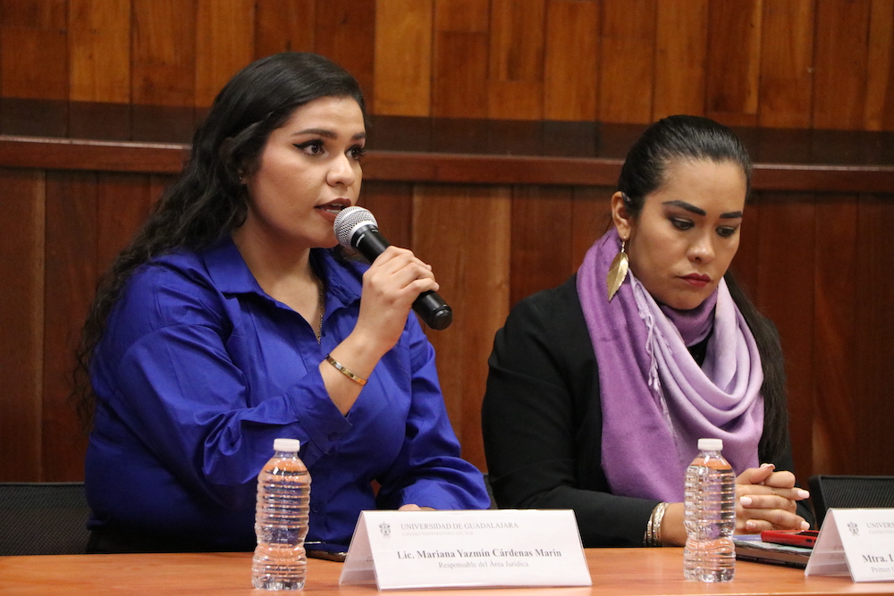 La licenciada Dulce María González Gómez, representante de la oficina de enlace de la Defensoría de los Derechos Universitarios de la UdeG, dio el contexto jurídico que sustenta las acciones que se llevan a cabo para la construcción de la cultura de la paz en la universidad.