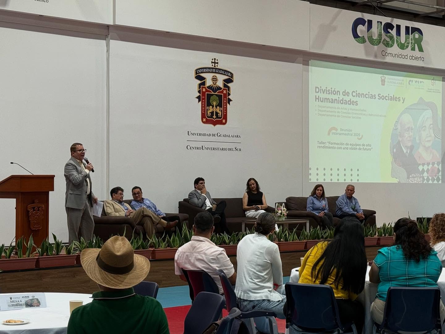 Durante su intervención, el doctor Dante Jaime Haro Reyes, Rector del CUSur, destacó la importancia de fortalecer la articulación entre departamentos y programas educativos, rompiendo inercias de trabajo aislado para fomentar sinergias académicas. “Que lo jurídico dialogue con lo social; lo económico, con lo humanístico; lo turístico, con lo artístico. Esta comunicación interdisciplinaria es un reto que debemos asumir hoy más que nunca”, afirmó, al tiempo que expresó su preocupación por la disminución de matrícula en áreas como Sociología, que actualmente cuenta con cerca de 60 espacios vacantes.