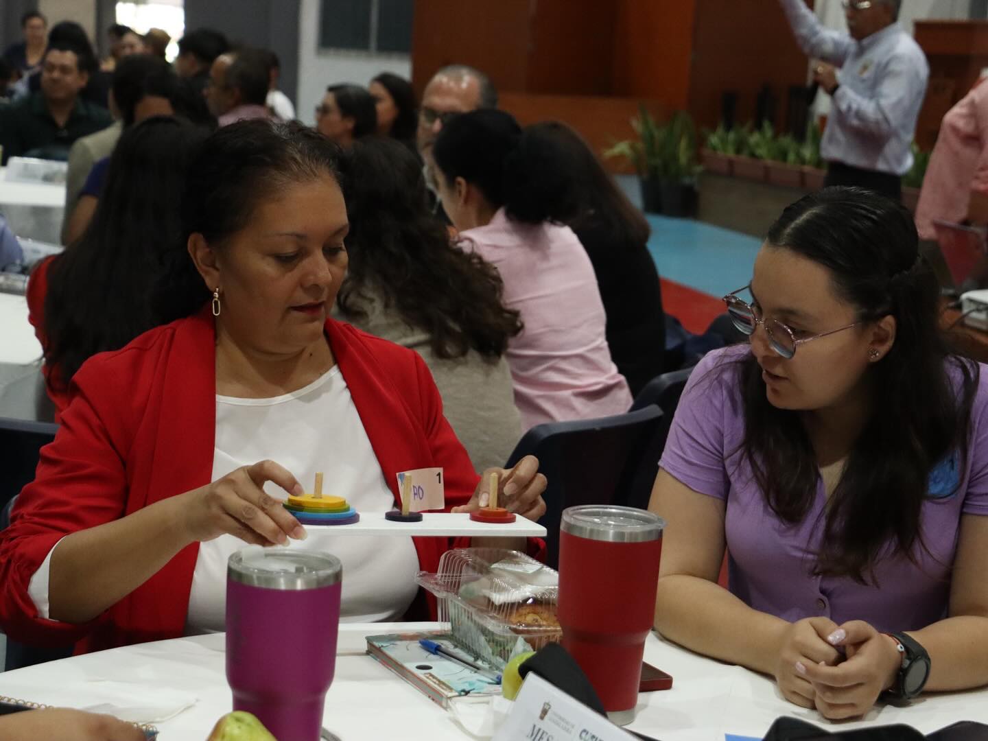 Parte de las actividades del taller “Formación de equipos de alto rendimiento para una visión de futuro” incluyó la participación de las y los docentes en diversas dinámicas colaborativas, como un juego de mesa que requería mover piezas estratégicamente para conservar la figura original, fortaleciendo el trabajo en equipo, la comunicación y la convivencia.
