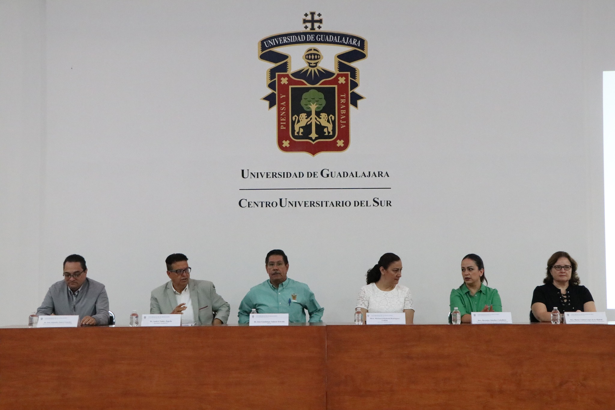 Durante la cuarta jornada sobre reprobación y apoyos institucionales para combatir los índices de reprobación y deserción del CUSur, se contó con la presencia de la maestra Mariana Elizabeth Domínguez Cobián, Secretaria Administrativa; la doctora María Cristina López de la Madrid, Directora de la División de Ciencias Exactas, Naturales y Tecnológicas; así como de la doctora Berenice Sánchez Caballero, Directora de la División de Ciencias de la Salud; y el doctor José Alejandro Juárez González, Director de la División de Ciencias Sociales y Humanidades.