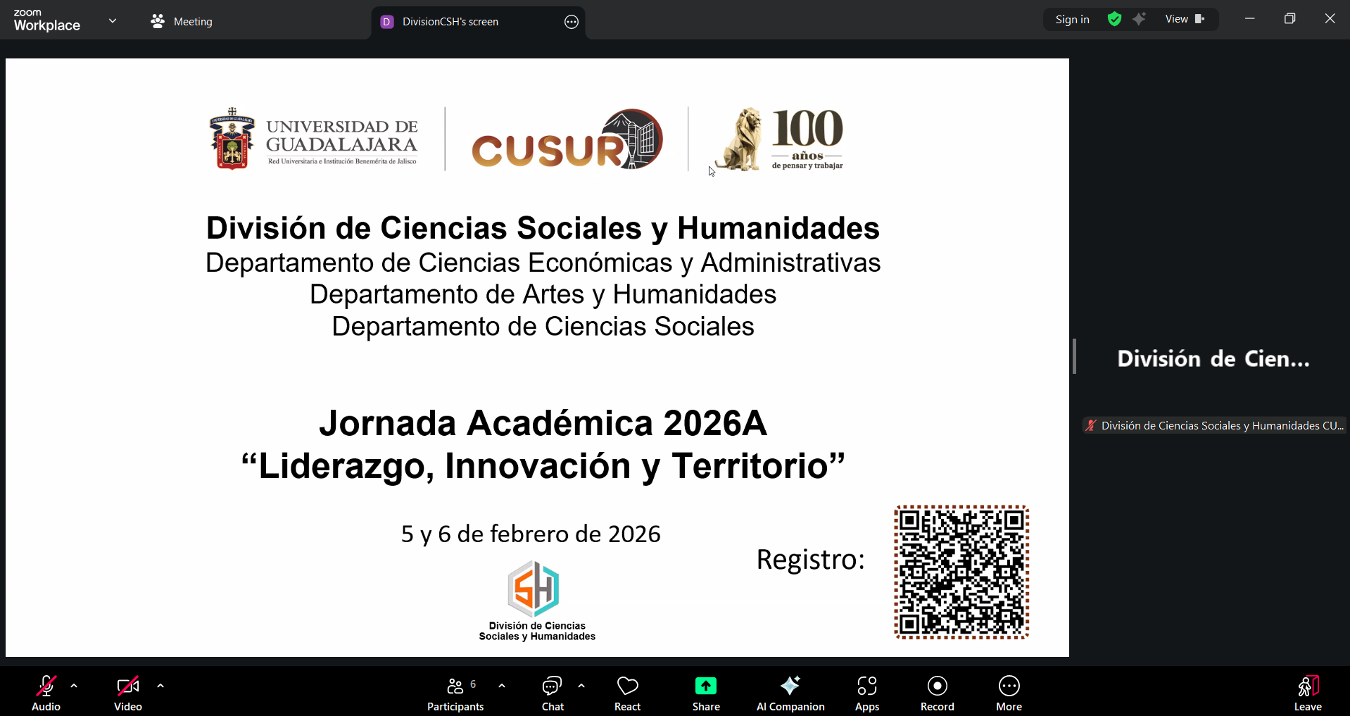 El Centro Universitario del Sur (CUSur) llevó a cabo, de manera virtual, el arranque de la Jornada Académica 2026-A “Liderazgo, innovación y territorio”, dirigida a estudiantes de las licenciaturas de la División de Ciencias Sociales y Humanidades, con el objetivo de fortalecer su formación académica y promover el análisis y la reflexión sobre el liderazgo, la innovación y su impacto en el entorno social y profesional.