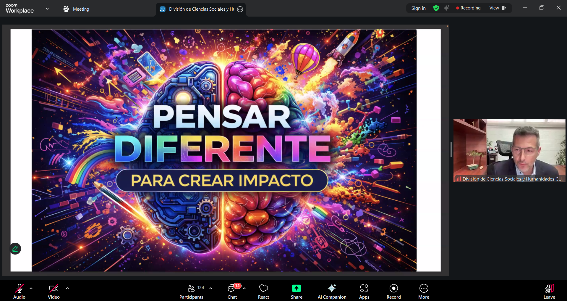 Como parte del programa, se impartió la conferencia virtual “Pensar diferente para crear impacto”, a cargo del maestro Juan Antonio Bernabé Caballero, especialista en gestión pública, liderazgo, innovación y desarrollo territorial, quien compartió su experiencia con la comunidad universitaria del CUSur.