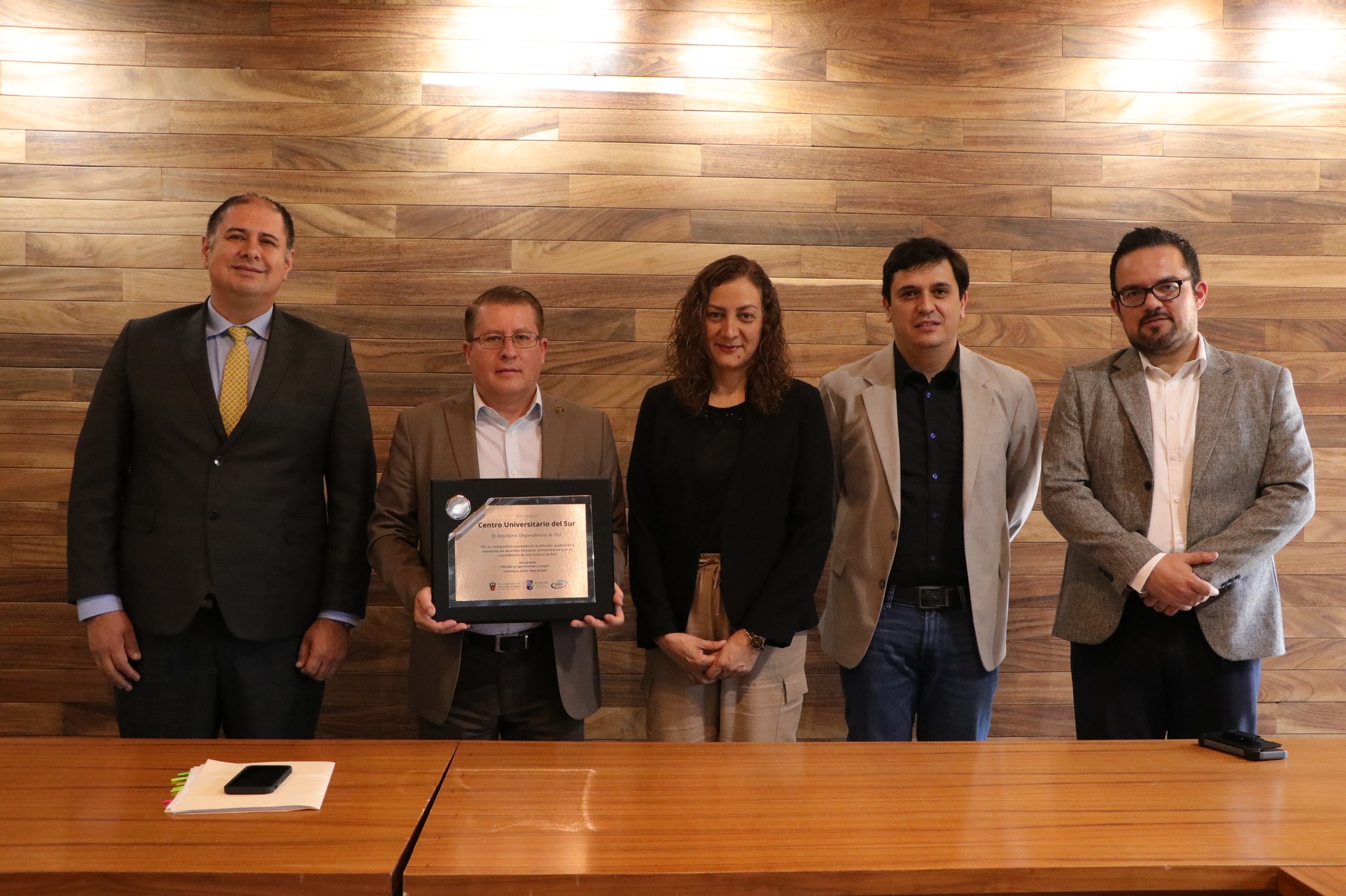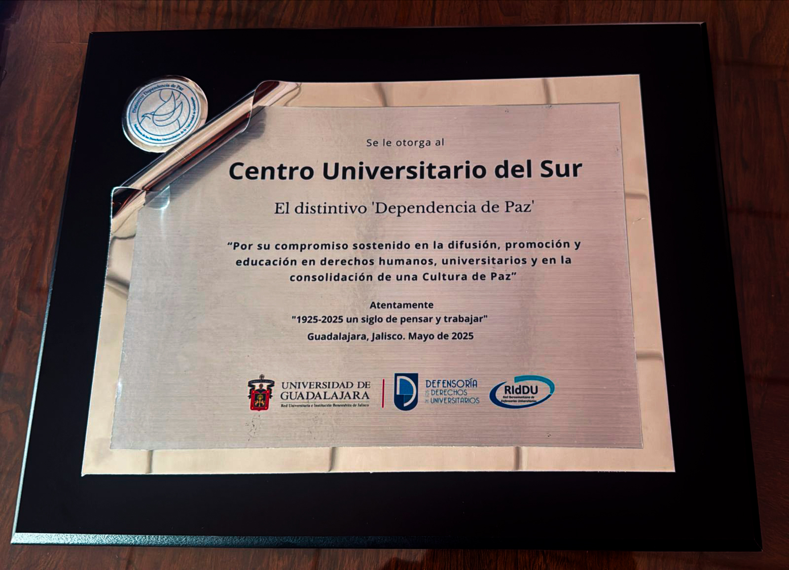 “Se otorga al Centro Universitario del Sur el Distintivo Dependencia de Paz, por su compromiso sostenido en la difusión, promoción y educación en derechos humanos universitarios y en la consolidación de una cultura de paz. Guadalajara, Jalisco, mayo de 2025. Defensoría de los Derechos Universitarios.”