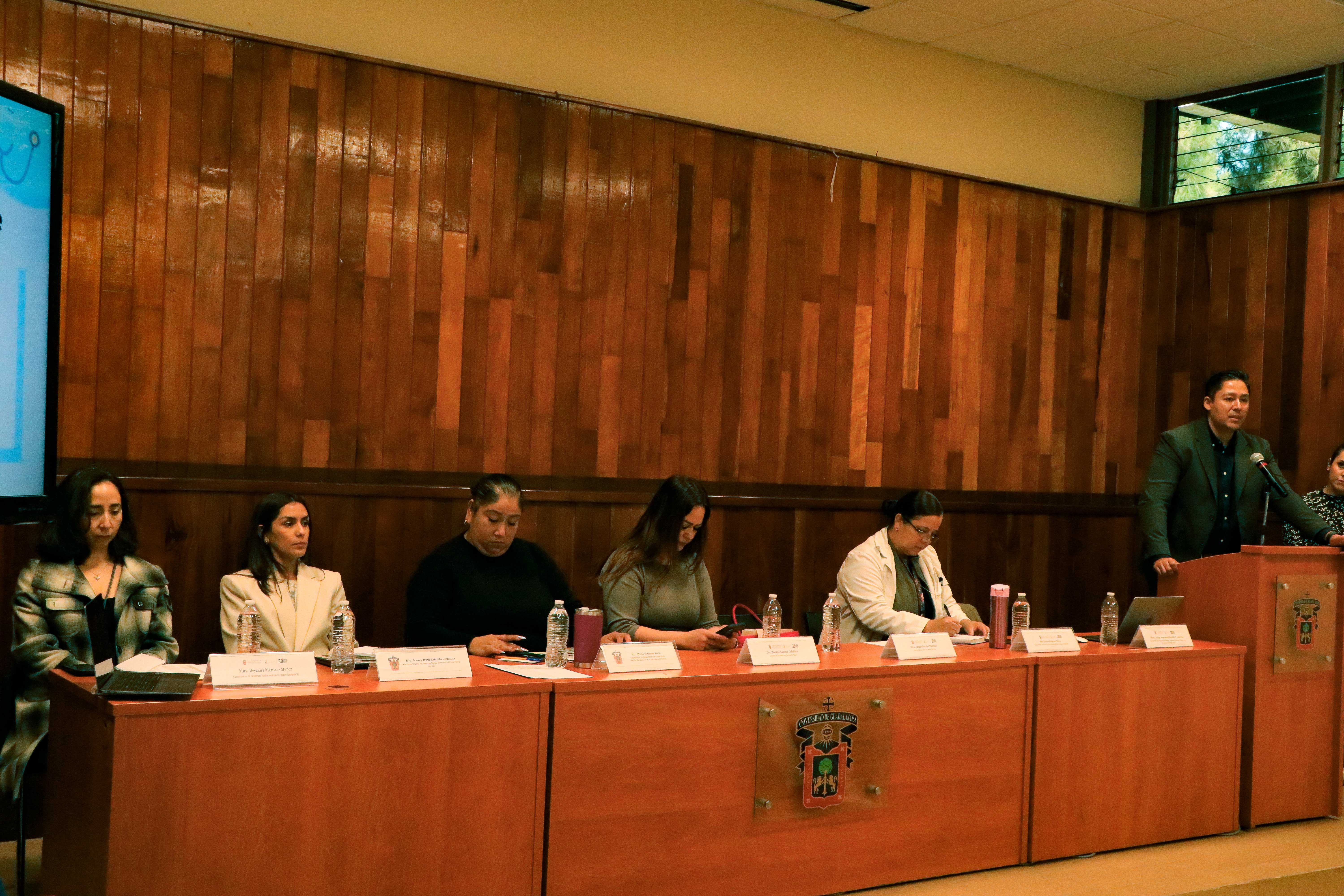 En el presídium estuvieron presentes destacadas autoridades académicas y de salud, como la doctora Nancy Rubí Estrada Ledesma, Jefa de la Unidad de Servicio Social; la maestra Joyce Flores Manzano, Coordinadora del Servicio Social de las carreras de Medicina y Odontología de la Secretaría de Salud Jalisco, quien participó de manera virtual; la doctora Teresa Gutiérrez, Coordinadora Clínica de Educación e Investigación de Salud del Hospital General de Zona número 9; la licenciada María Espinosa Ruiz y la maestra Deyanira Martínez Muñoz, Coordinadoras de Desarrollo Institucional de las regiones sanitarias VI y VII, respectivamente.