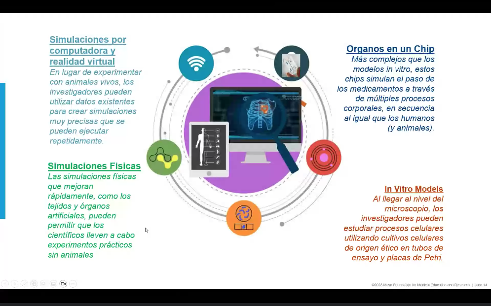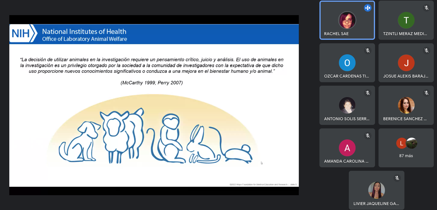 Las jornadas comenzaron con la ponencia “Hacia un futuro compasivo: Bienestar de los animales de laboratorio en el siglo XXI”, impartida por la doctora en Ciencias Biomédicas Rachel Saravia Estrada, en la que habló sobre el bienestar animal en la investigación científica. Dijo que a los animales que se utilizan para este medio se les brinda atención por parte de un veterinario, se les brinda agua y alimento y un alojamiento en donde sean capaces de convivir con otros animales, así mismo señaló que la decisión de utilizarlos en la investigación requiere un pensamiento crítico, juicio y análisis, y que poco a poco se ha buscado mejorar sus condiciones de vida.