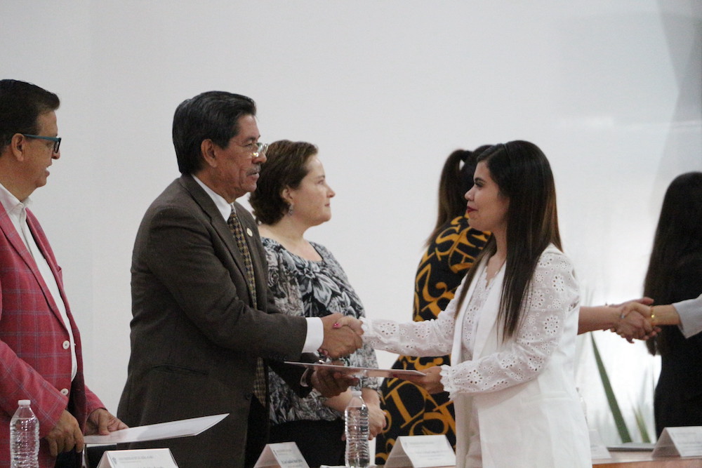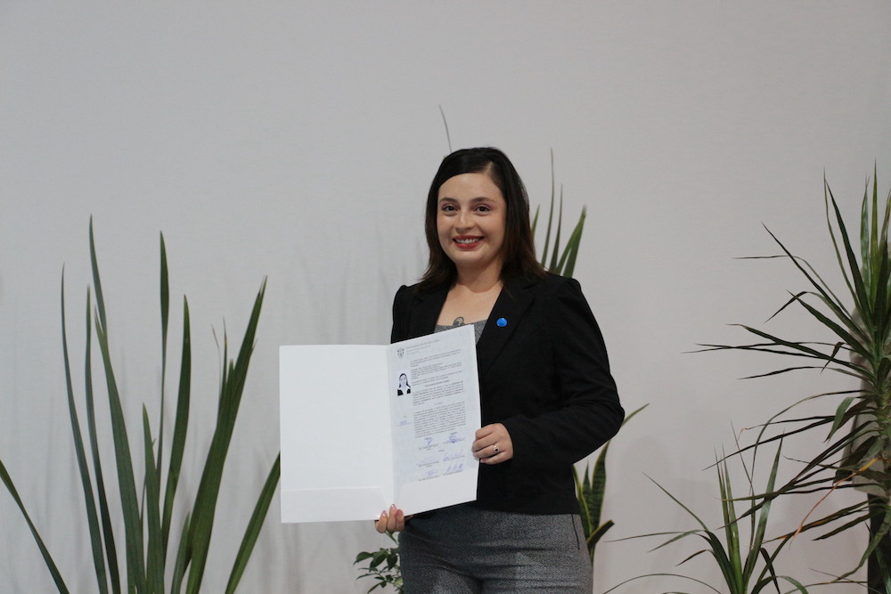 María Odisea Moreno Ruiz, egresada de Trabajo Social, en representación de los titulados, dio un discurso en el que agradeció a profesores, compañeros y padres, reconoció la incertidumbre a la que se enfrentan al concluir esta etapa, el esfuerzo que significó llegar a ese momento y recordó que “hoy hay que sentirnos orgullosos de lo que hemos logrado, reconozcamos ese esfuerzo, seamos agradecidos”.