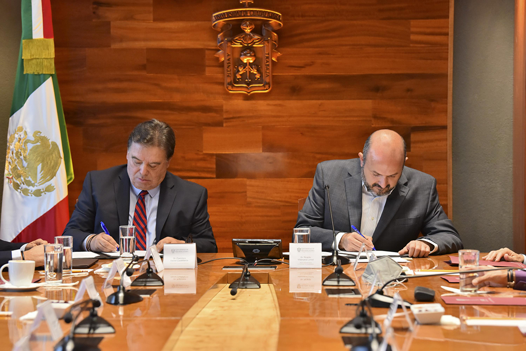 En la Sala José Clemente Orozco del edificio de Rectoría General signaron el convenios los rectores y la rectora de los centros universitarios de los Altos (CUAltos), de la Ciénega (CUCiénega), de la Costa (CUCosta), de Ciencias de la Salud (CUCS), del Sur (CUSur), de Tlajomulco (CUTlajomulco), de los Valles (CUValles); así como el Abogado General de la UdeG