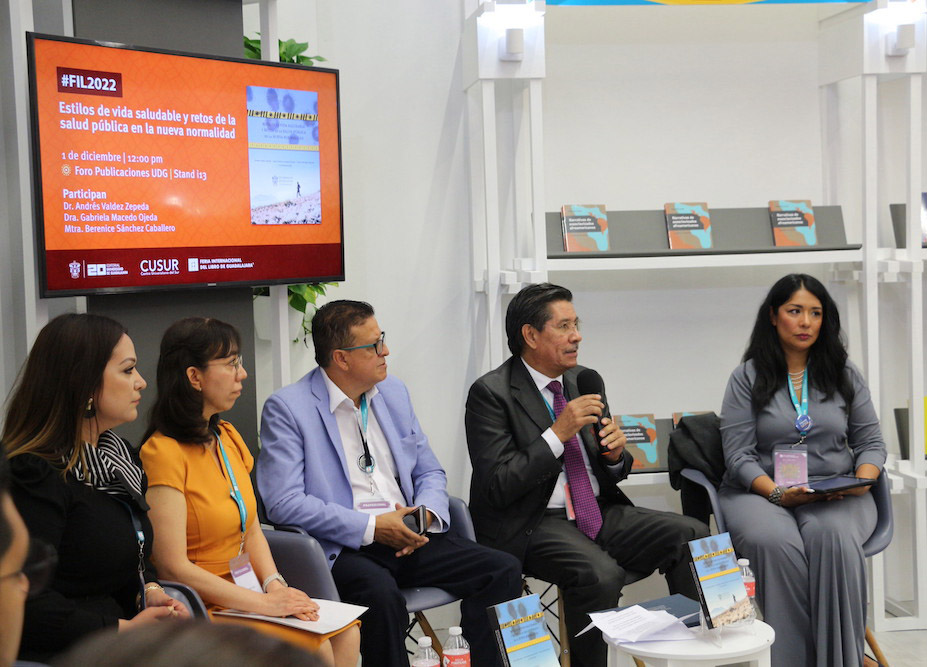 El pasado jueves 01 de diciembre se llevó a cabo la presentación del libro Estilos de vida saludable, retos de la salud pública en la nueva normalidad de los autores José Guadalupe Salazar Estrada, Andrés Valdez Zepeda y Esther Barragán Bautista en el Foro de publicaciones UdeG de la Feria Internacional del Libro (FIL) de Guadalajara.