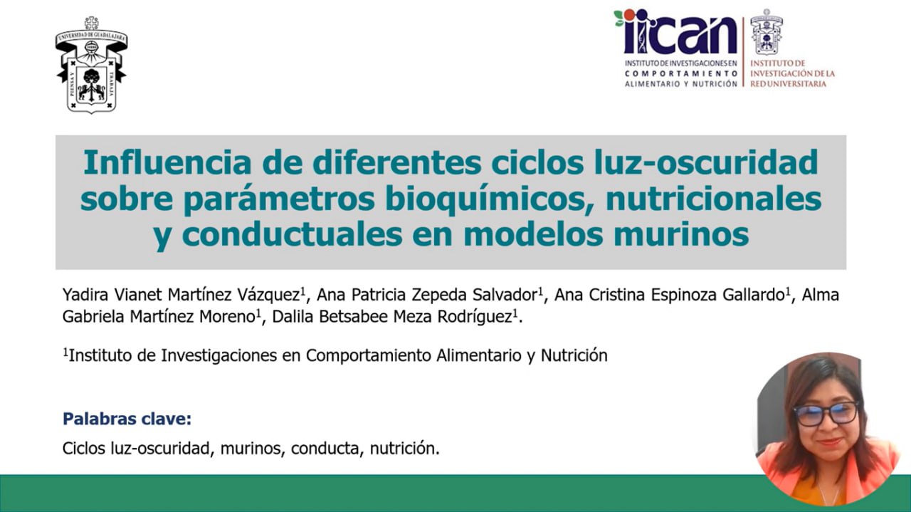 - Segundo lugar, modalidad virtual, categoría Protocolo de investigación, “Influencia de diferentes ciclos luz-oscuridad sobre parámetros bioquímicos, nutricionales y conductuales en modelos murinos”, de Yadira Vianet Martínez-Vázquez. Co-autoras: doctoras Ana Patricia Zepeda-Salvador, Ana Cristina Espinoza-Gallardo, Alma Gabriela Martínez-Moreno y Dalila Betsabee Meza-Rodríguez.
