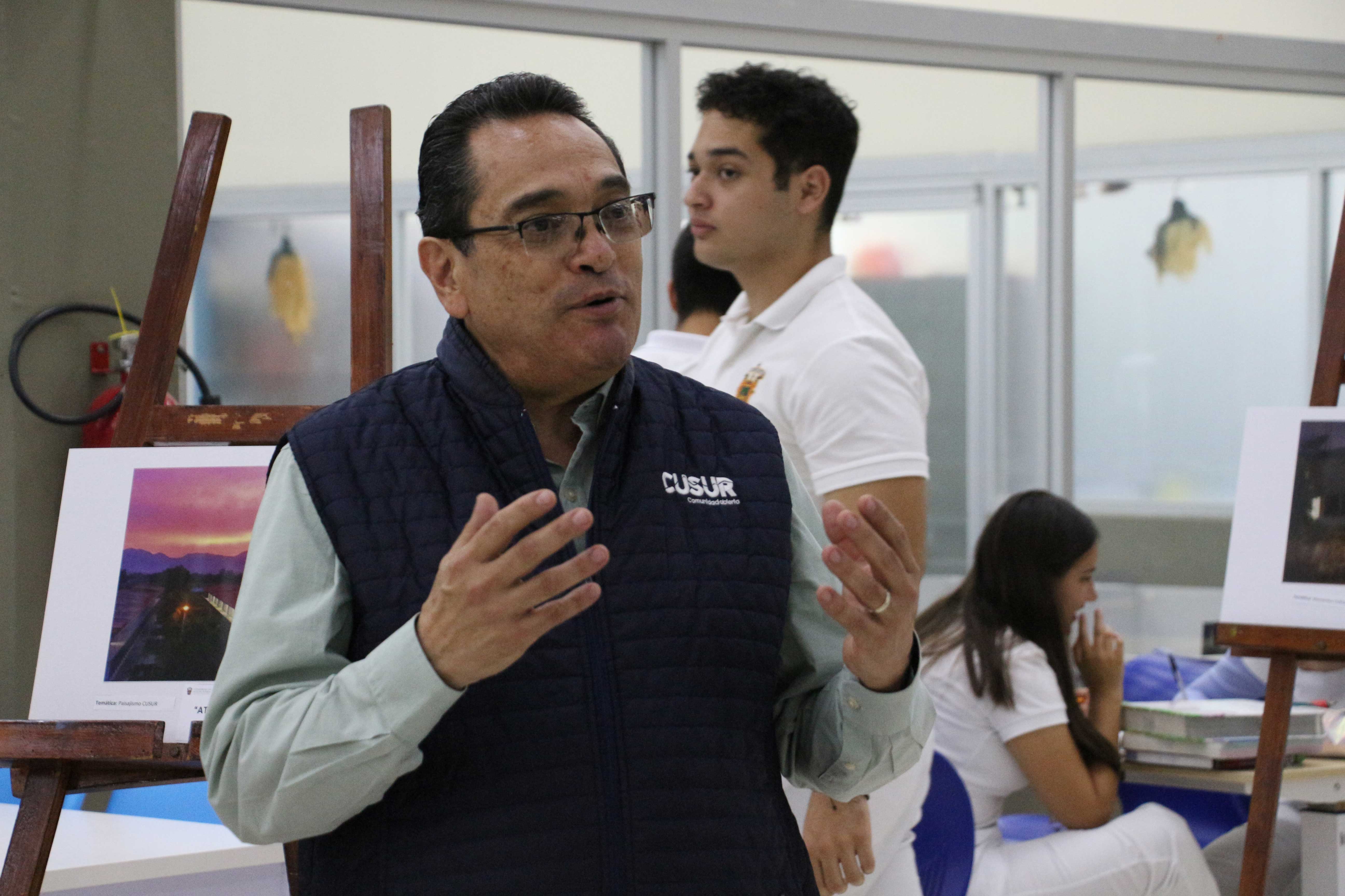 El doctor José Alejandro Juárez González, director de la División de Ciencias Sociales y Humanidades, subrayó la relevancia de las fotografías en la memoria universitaria, mencionando cómo estas imágenes reflejan el transitar de las generaciones y los cambios que el CUSur ha experimentado desde el 25 aniversario de la Red Universitaria.