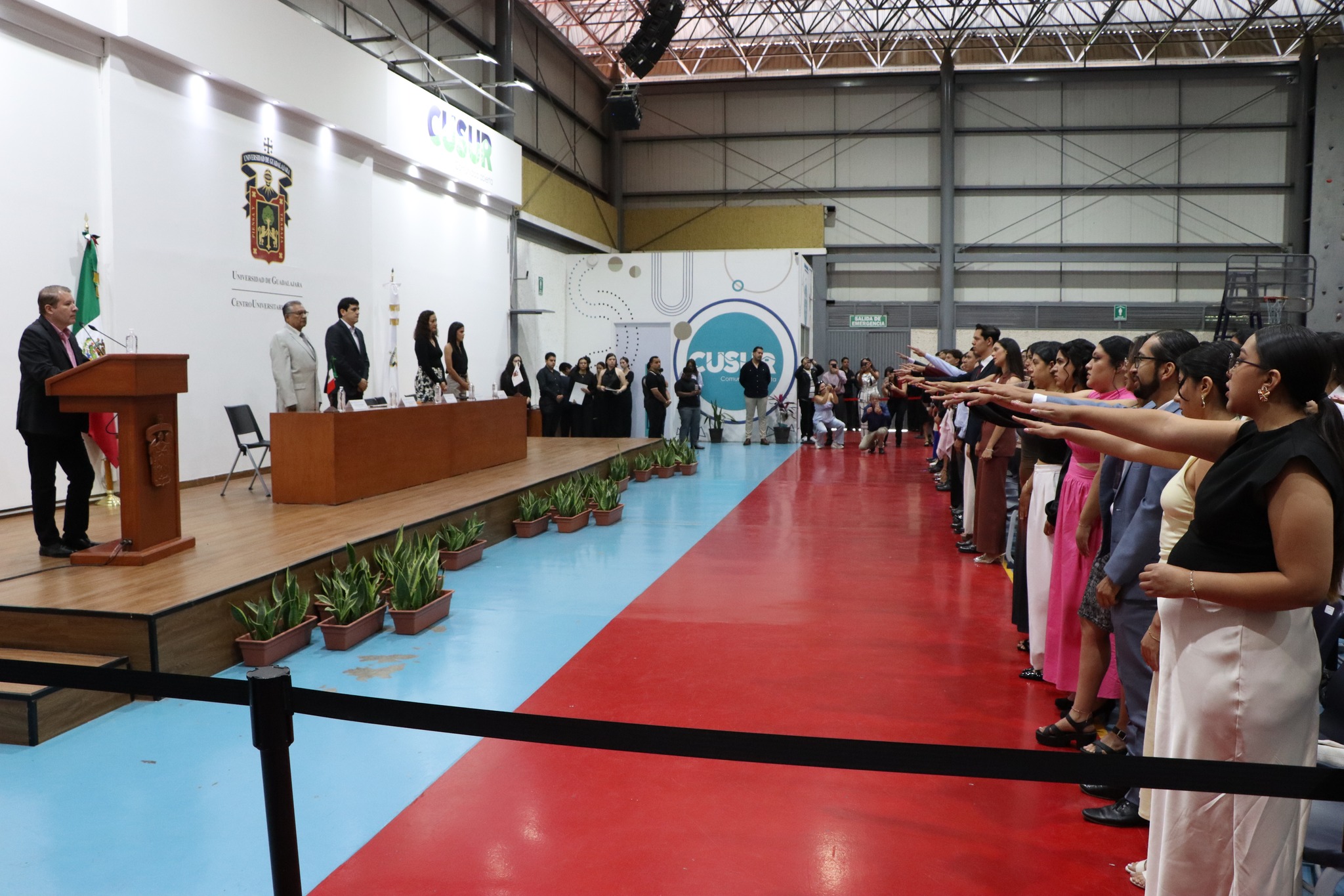 Durante su mensaje, el Rector Doctor Jaime Dante Haro Reyes destacó que, más allá de los conocimientos adquiridos, la Universidad de Guadalajara busca formar profesionales con valores, capaces de ejercer una ciudadanía comprometida y de generar un impacto positivo en la sociedad. Subrayó que cada disciplina, desde su propio ámbito, contribuye al desarrollo social y al bienestar colectivo.