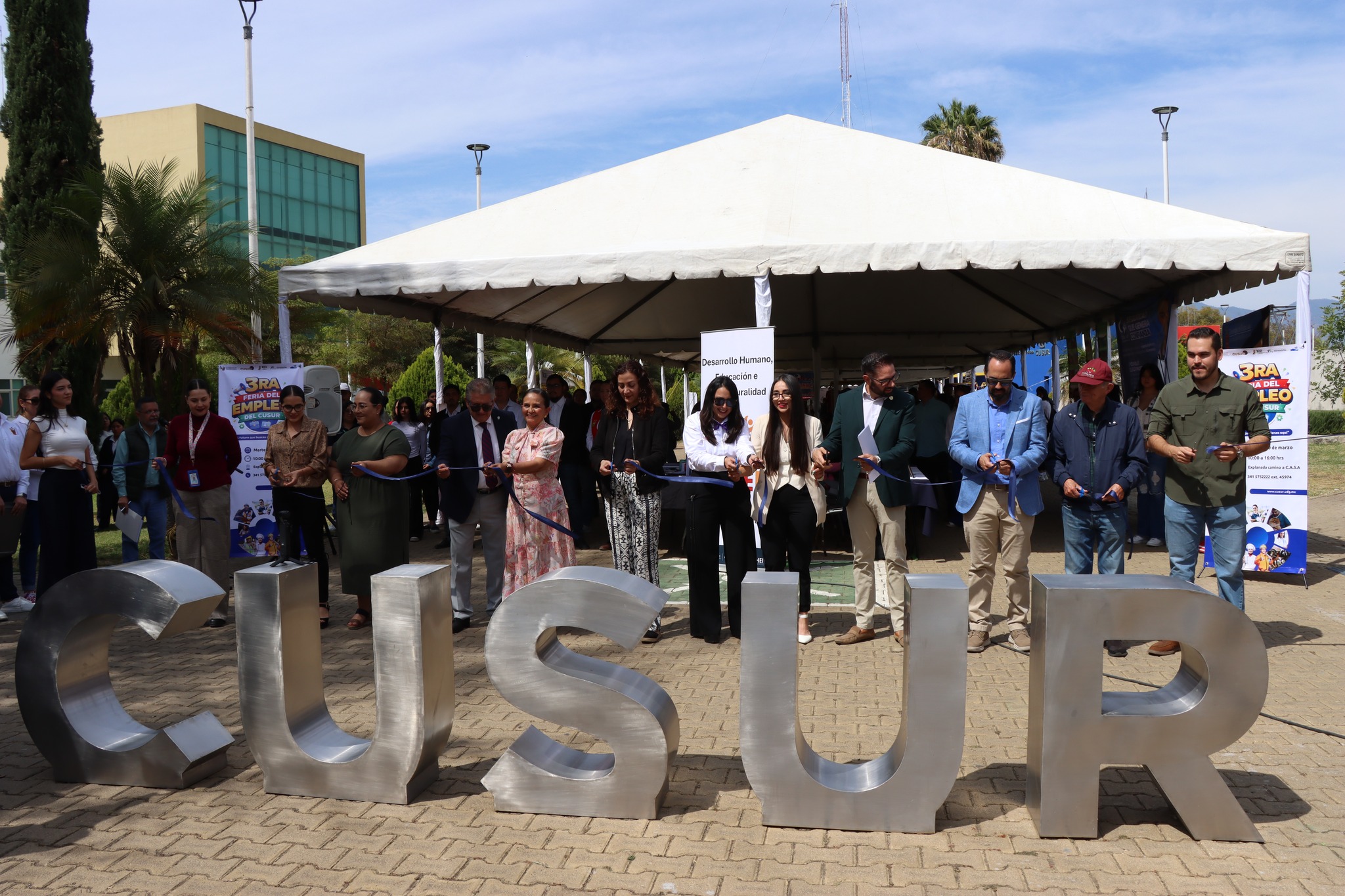 El evento de inauguración concluyó con el corte de listón inaugural, encabezado por la Mtra. Mariana Domínguez Cobián, secretaria administrativa del CUSur, con lo que oficialmente dieron inicio las actividades de la Tercera Feria del Empleo CUSur 2026, un espacio diseñado para impulsar la vinculación, el talento universitario y el desarrollo profesional de la comunidad.