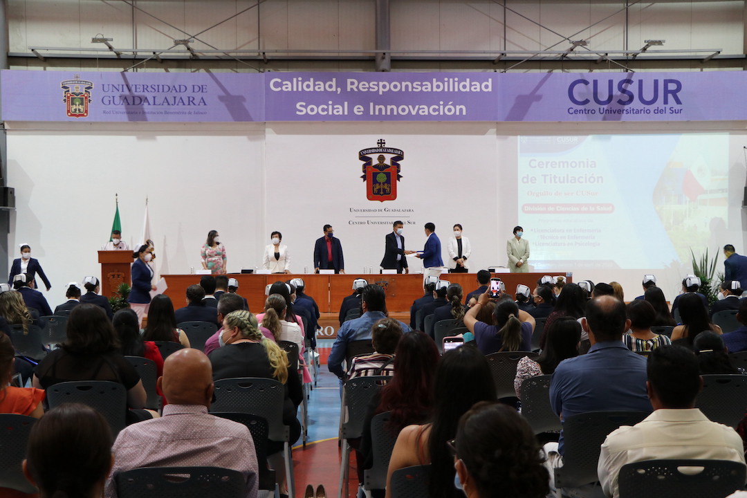 Los actos estuvieron presididos por el doctor Jorge Galindo García, Rector del CUSur, quien cedió la voz a dos académicas de las áreas de la salud para que tomaran protesta a los respectivos graduados de cada ceremonia.