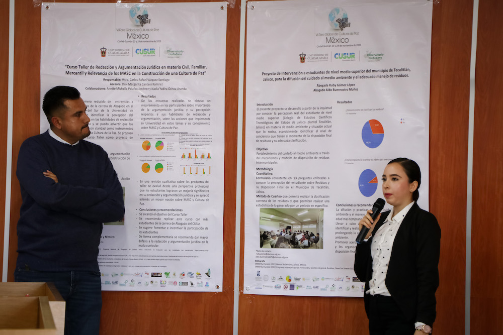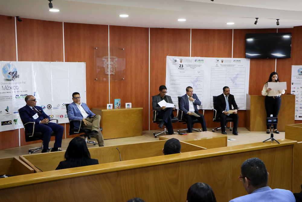 En la Sala de Juicios Orales del Centro Universitario del Sur (CUSur) tuvo lugar la inauguración del VI Foro Global de Cultura de Paz, bajo el lema “Acciones para la Paz”. El evento tiene como objetivo analizar los avances de la cultura de paz con un enfoque ciudadano, a través de la educación, el desarrollo y la transformación a nivel nacional e internacional, con el fin de alcanzar los objetivos de paz, justicia y seguridad. Es organizado por la Defensoría de los Derechos Universitarios de la Universidad de Guadalajara (UdeG).
