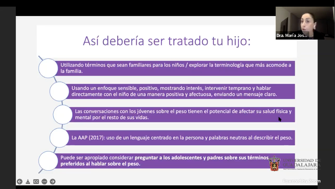 La doctora Karina Franco Paredes, Coordinadora de la Maestría en Psicología con orientación en Calidad del Vida y Salud, del CUSur, agradeció a los ponentes y recalcó las “recomendaciones muy puntuales que hemos escuchado de los expertos, sobre cómo trabajar los TCA a nivel familiar o como sociedad, para contribuir a que estos trastornos sean cada vez menores”.