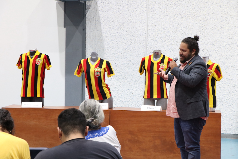 Arturo Martínez muestra la colección de camisetas de Leones Negros en el CUSur