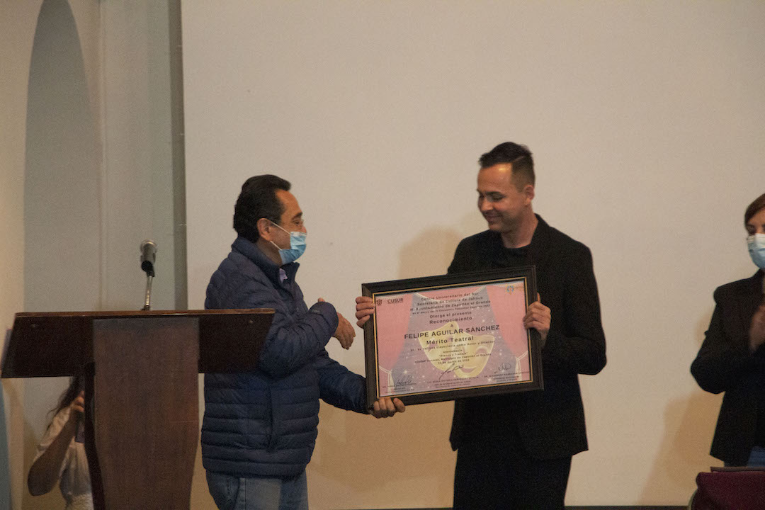 Se entregó el reconocimiento al Mérito teatral al director de “Studio Lenea Teatro” Felipe Aguilar Sánchez, por la carrera teatral que ha formado a lo largo de los últimos años, y su trabajo y esfuerzo en la realización de teatro educativo para la comunidad zapotlense. Aguilar Sánchez dijo que “nada es mío, todo es todos, hay muchas personas detrás que también se merecen este reconocimiento como todos los que trabajan para el teatro, mi familia, colegas y compañeros teatreros que me retroalimentan en esta labor”.