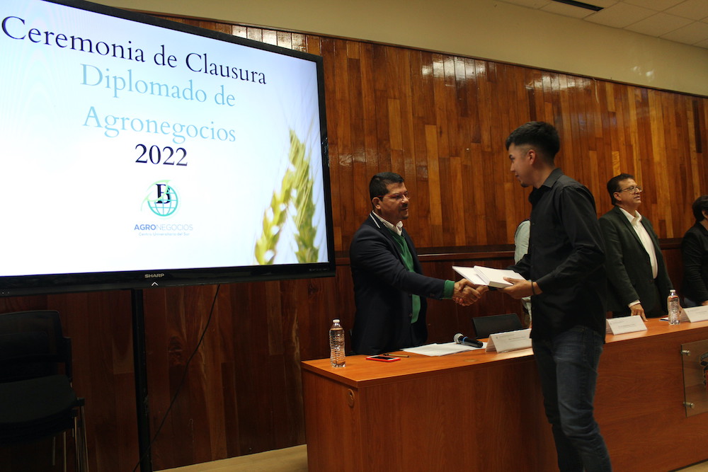 Como parte de la educación continua que ofrece el Centro Universitario del Sur (CUSur), este miércoles 25 de enero se llevó a cabo la clausura del Diplomado en Agronegocios 2022 en el auditorio Antonio González Ochoa de este centro.