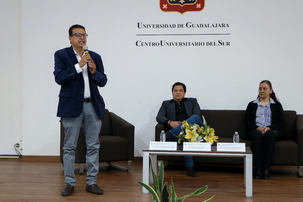 El doctor Andrés Valdez Zepeda, Secretario Académico, dirigió unas palabras en representación del Rector del CUSur, el doctor José Guadalupe Salazar Estrada, resaltando la importancia de esta conferencia informativa y formativa en el contexto de los recientes acontecimientos de violencia criminal ocurridos hace 15 días en Ciudad Guzmán. Como institución educativa, el centro universitario se encuentra en la obligación de educar y formar universitarios en temas fundamentales como la cultura de la paz y la cultura de la legalidad.