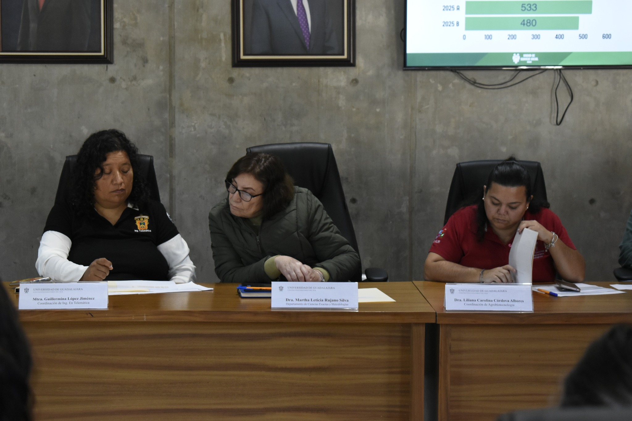 En la presentación de datos, se informó que para el calendario 2026-A se cuenta con 480 aspirantes registrados, mientras que las solicitudes de plazas alcanzaron las 2,040, convirtiéndose en el periodo con mayor demanda en los últimos tres ciclos. Del total de programas aprobados en el periodo anterior, el 56% correspondió a programas internos del CUSur y el 44% a programas externos, distribuidos en sectores como educación, salud, gobierno, laboratorios, áreas académicas y programas especiales del sur.