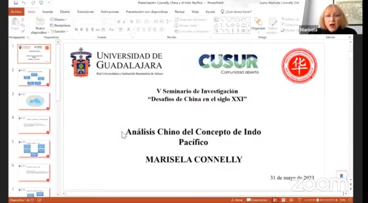 El seminario dio inicio con la conferencia magistral “Análisis chino del concepto de Indo Pacífico”, presentada por la doctora Marisela Connelly, maestra e investigadora del Colegio México en el centro de estudios de Asia y África en el área de China. Habló de la percepción china de la estrategia Indo Pacifico que muestra a un Estados Unidos que desea mantener su sistema hegemónico, con el pretexto de impulsar la libertad regional y apertura, aunque realmente, según académicos, lo que busca es dividir la región de Asia-Pacífico, creando grupos que minen la paz y la estabilidad de la región, mientras que China, desea la paz y la estabilidad para que continúe el desarrollo económico de la región, y se cumplan los objetivos de mediano y largo plazo.