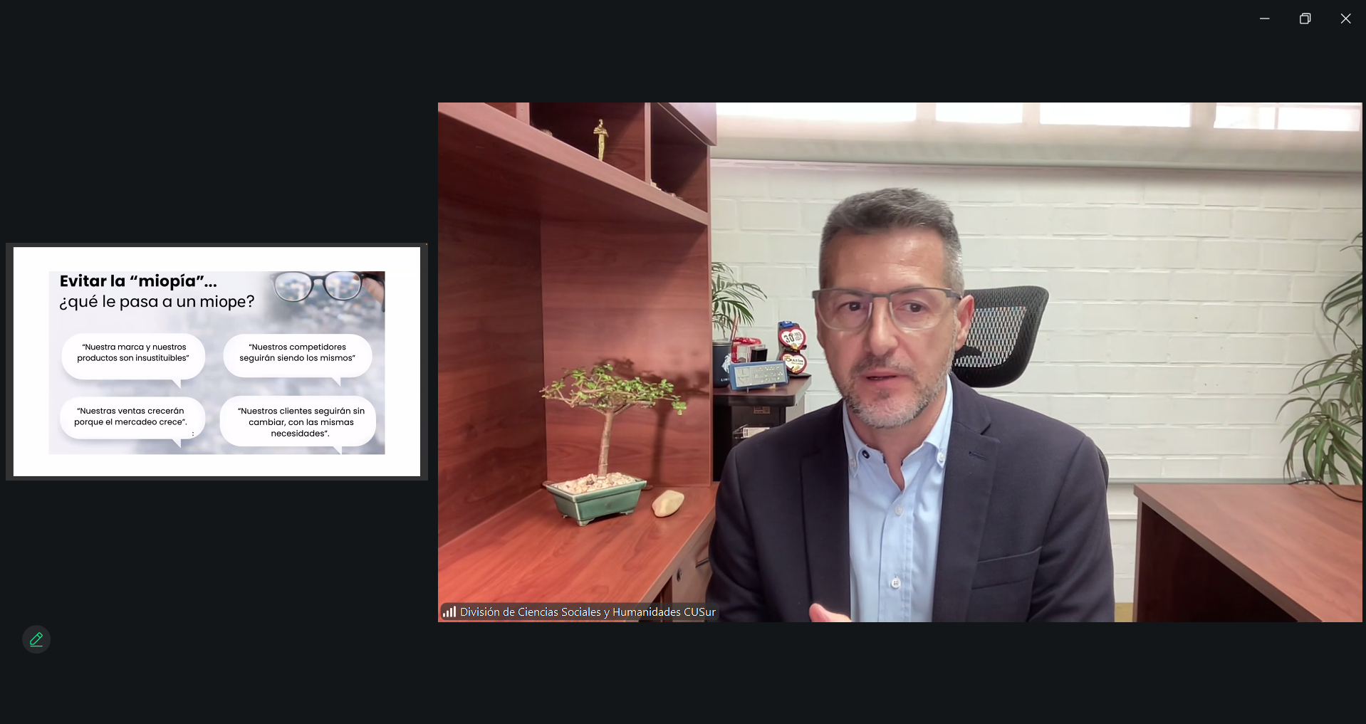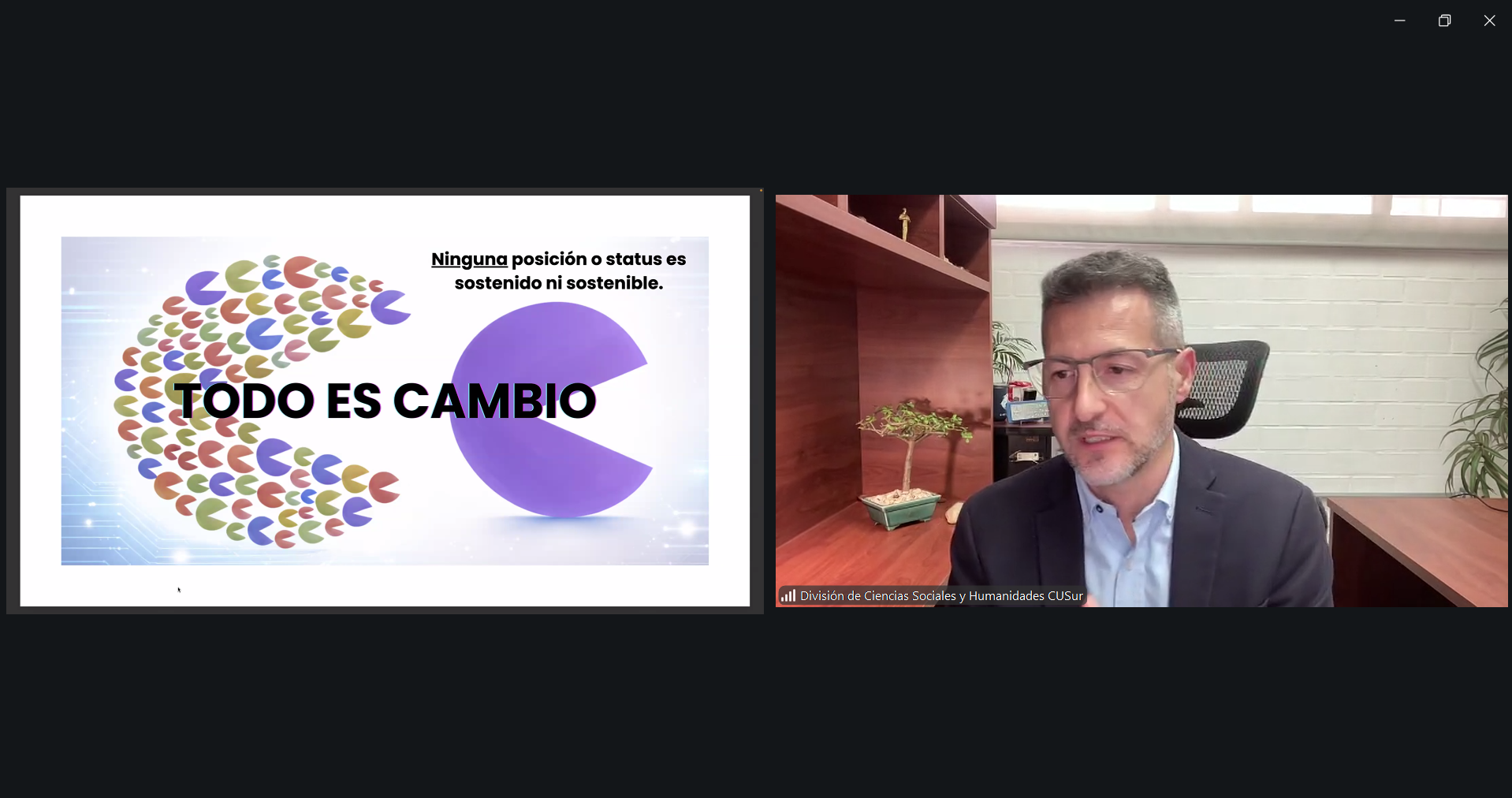 Como parte del programa, se impartió la conferencia virtual “Pensar diferente para crear impacto”, a cargo del maestro Juan Antonio Bernabé Caballero, especialista en gestión pública, liderazgo, innovación y desarrollo territorial, quien compartió su experiencia con la comunidad universitaria del CUSur.
