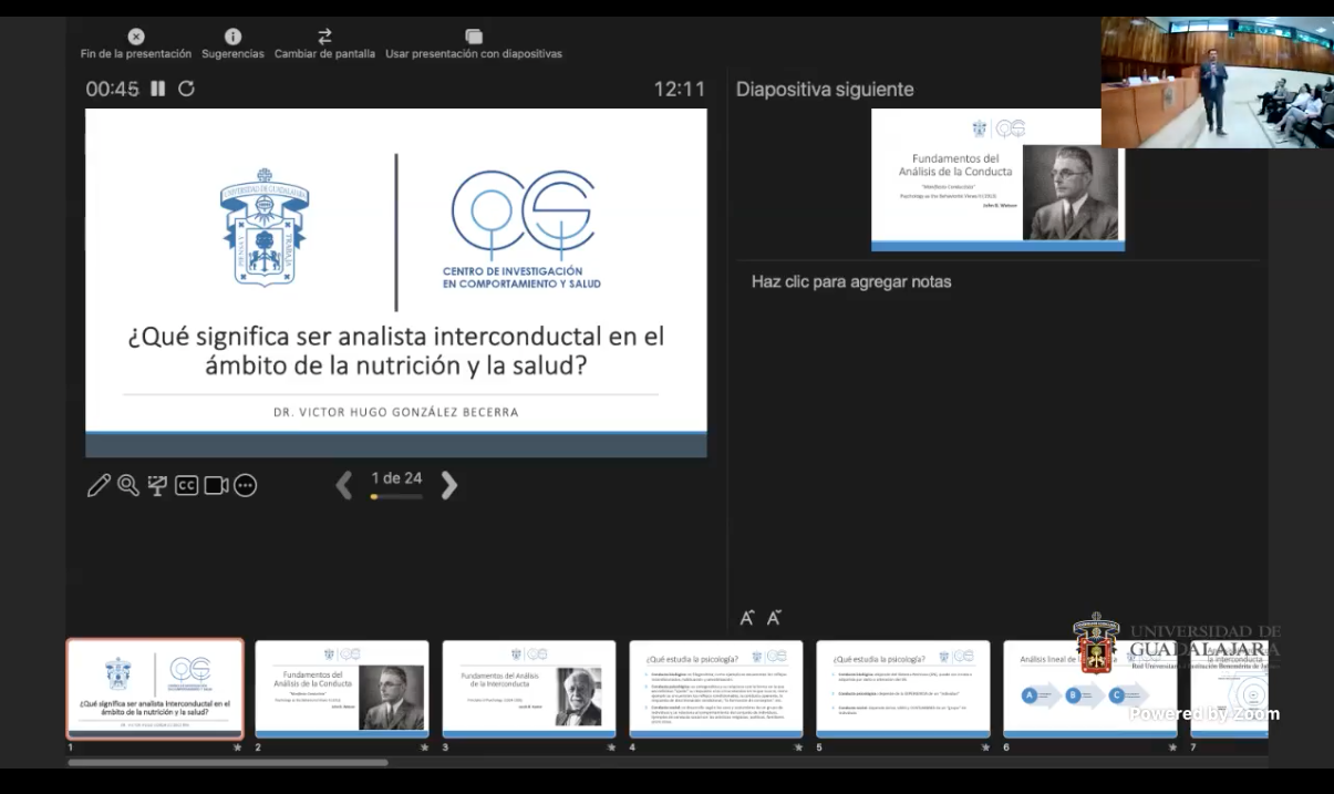 Luego de la inauguración, dieron inicio las ponencias de los investigadores: “Análisis del comportamiento alimentario sostenible”, por la doctora Alma Gabriela Martínez Moreno; “Función auto-reguladora de la conducta en procesos de salud-enfermedad”, por la doctora Samantha Josefina Bernal Gómez; “Modificación de la conducta y actividad física en escolares”, por el maestro Iván Alejandro Caldera Zamora; y“¿Qué significa ser analista interconductual en el ámbito de la nutrición y la salud?”, por el doctor Víctor Hugo González Becerra.