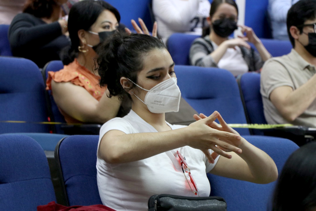 Más tarde se llevó a cabo un micro curso de Lengua de Señas Mexicana (LSM) impartido por la maestra Lydia Karen Chávez Saldaña, coordinadora de la licenciatura en Trabajo Social del CUSur, quien enseñó a los asistentes el abecedario en LSM y algunas palabras y saludos comunes en la comunidad silente. Para concluir el evento se proyectó el documental Piraha, La lengua de la felicidad, un producto audiovisual sobre la lengua proveniente de esta tribu amazónica.