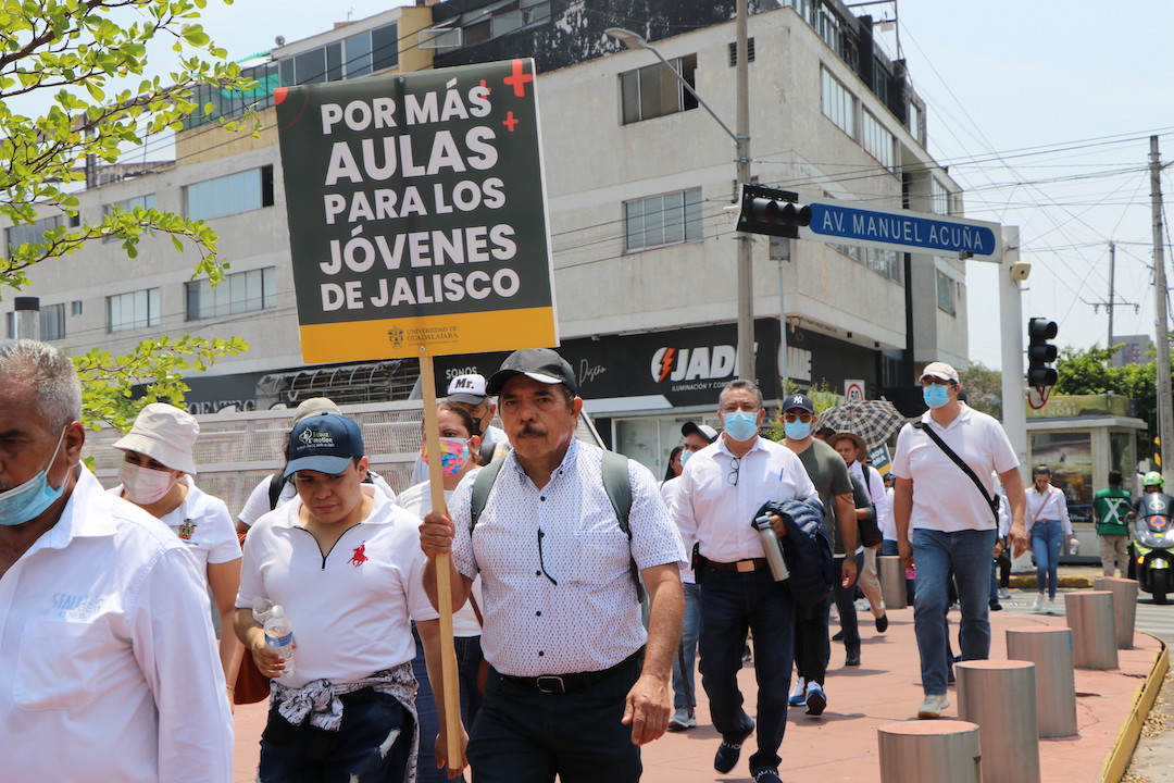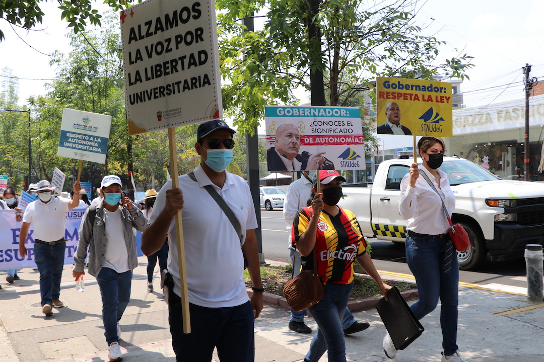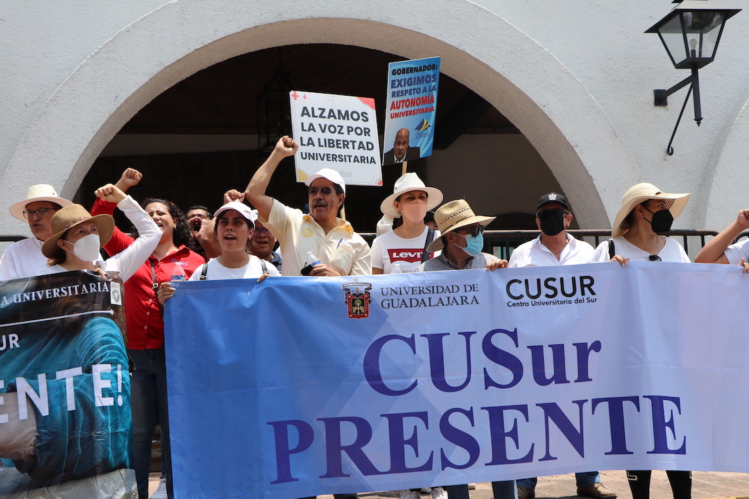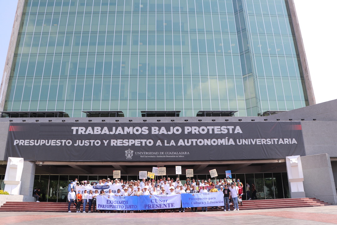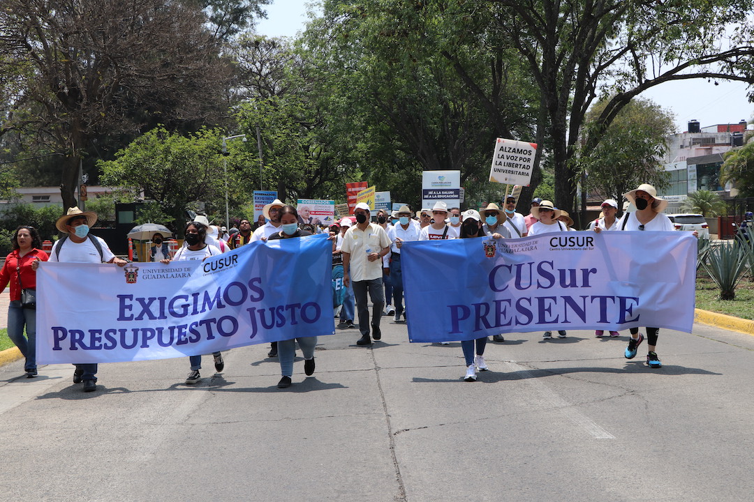 En punto de las 11:53 horas, estudiantes, y personal académico y administrativo del Centro Universitario del Sur (CUSur) partieron del edificio de Rectoría General rumbo a Casa Jalisco para exigir respeto por la autonomía universitaria y que sean devueltos los 140 millones de pesos que se habían asignado para la construcción del Museo de Ciencias Ambientales (MCA).