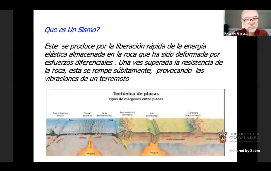 En la conferencia, García de Alba expuso que un sismo “se produce por la liberación rápida de la energía elástica almacenada en la roca que ha sido deformada por esfuerzos diferenciales. Una vez superada la resistencia de la roca, ésta se rompe súbitamente, provocando las vibraciones de un terremoto”.