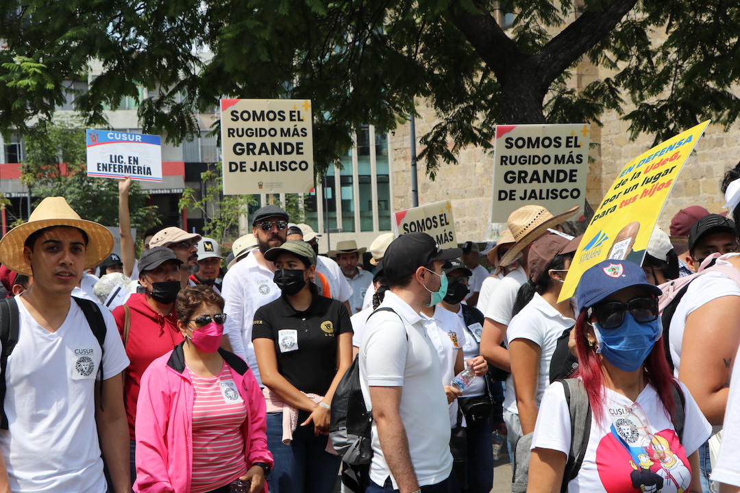 Frente a la Fuente Olímpica se congregaron trabajadores, estudiantes, académicos y personal de los centros universitarios de Ciencias de la Salud (CUCS), de Arte, Arquitectura y Diseño; las preparatorias 2, 3, 11, 14 y 18 y del Hospital Civil de Guadalajara (HCG).