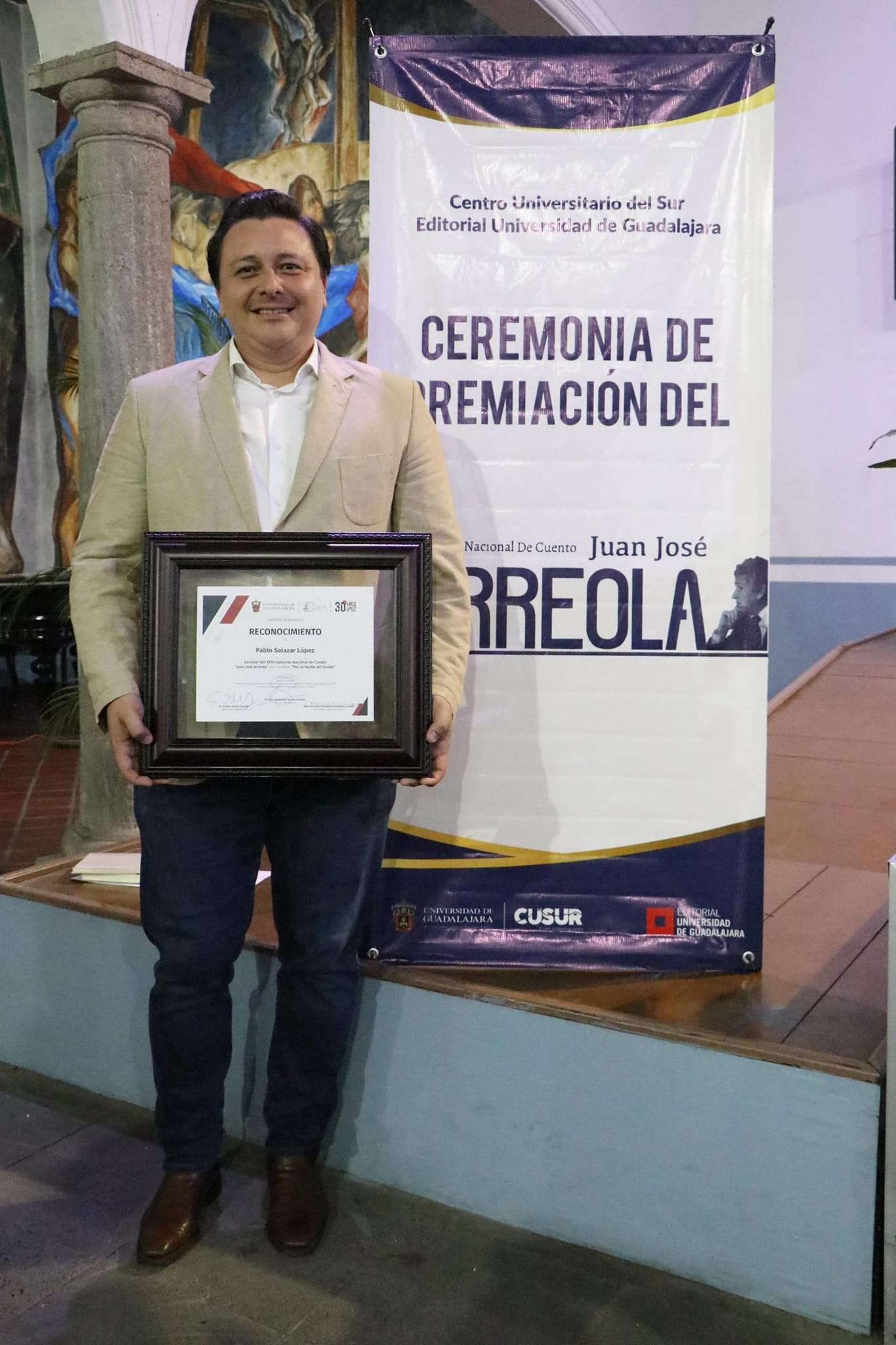 El escritor Pablo Salazar López se consagró como ganador del XXIII Concurso Nacional de Cuento Juan José Arreola con su obra "Tras la huella del ñandú". La ceremonia tuvo lugar en la Casa del Arte Dr. Vicente Preciado Zacarías del Centro Universitario del Sur (CUSur) de la Universidad de Guadalajara (UdeG), y contó con la presencia del doctor José Guadalupe Salazar Estrada, Rector del CUSur, quien entregó el premio y resaltó la importancia de este certamen en la promoción de la literatura mexicana.