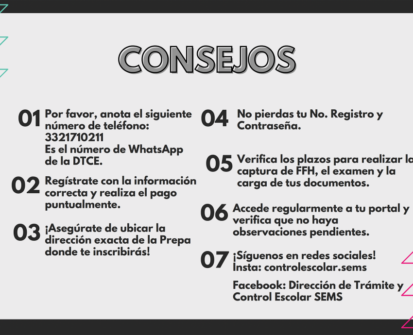 “Tenemos el número de whatsApp de atención, 33-2171-0211. Las recomendaciones son: regístrate con la información correcta y realiza el pago puntualmente. Asegúrate de ubicar la dirección exacta de la preparatoria donde te inscribirás, no pierdas tu número de registro y contraseña. Accede regularmente a tu portal y verifica que no haya observaciones pendientes”, precisó.