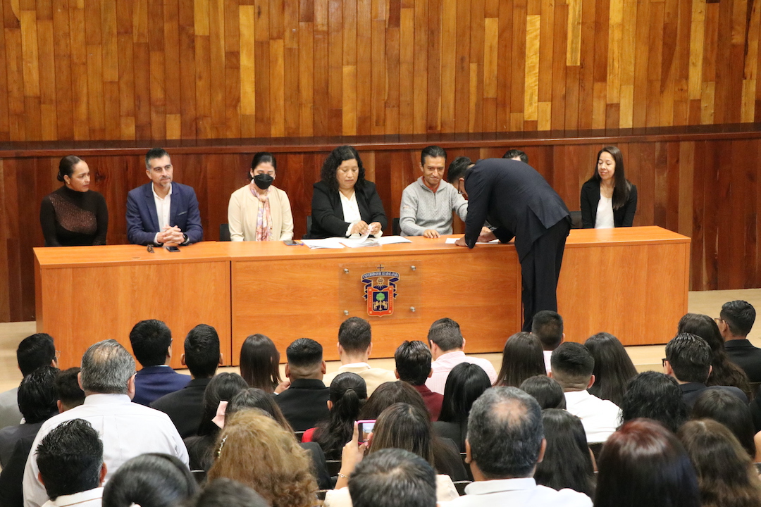 En el acto académico, el maestro Gerardo Jiménez Haro, Secretario del Comité de Titulación de la Ingeniería en Telemática, leyó el acta y posteriormente, cada egresado pasó a plasmar su firma en su respectivo documento.