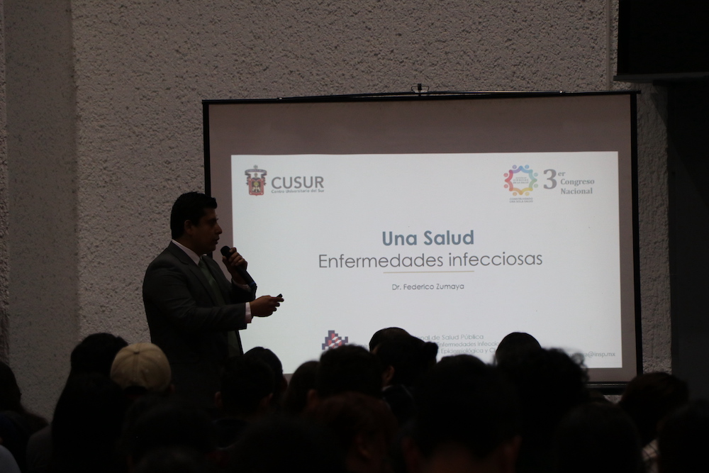 Ese primer día de actividades tuvo lugar la conferencia magistral titulada “Una salud en las enfermedades infecciosas”, dictada por el doctor Federico Alonso Zumaya Estrada, quien habló del antropocentrismo como una visión errada dentro de las ciencias de la salud. Además, expuso sobre bacterias y microorganismos en general, así como sus vías de transmisión. Posteriormente, Zumaya habló sobre distintos escenarios de las enfermedades infecciosas, tomando en cuenta estadísticas y hechos históricos, resaltó que para lograr avances en la salud pública es necesario el trabajo multidisciplinar, mencionando que “la salud pública como tal constituye un encuentro entre lo biológico, lo social, el individuo, lo técnico, lo político, el pensamiento y la acción”.