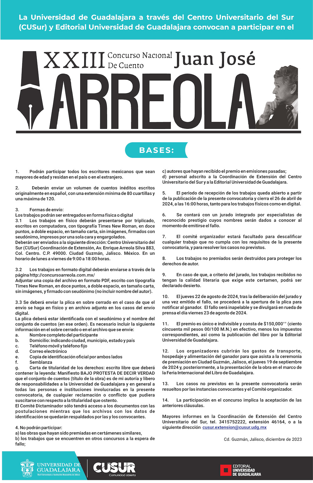 Las bases de la convocatoria del XXIII Concurso Nacional de Cuento Juan José Arreola están disponibles en el sitio http://www.concursoarreola.com.mx/